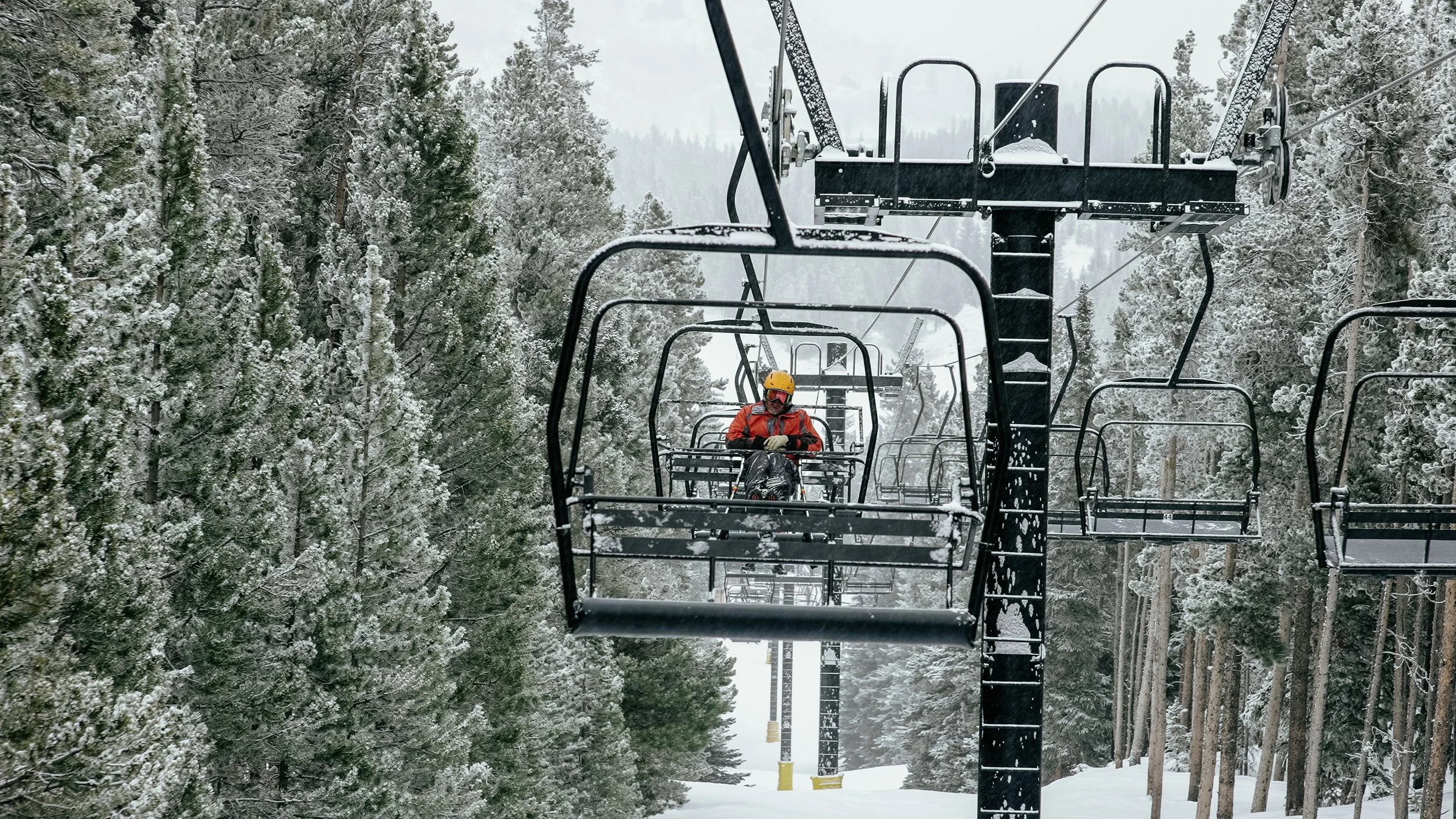 A person wearing an orange jacket, yellow helmet, and goggles riding a ski lift over a snowy forest with snow-covered trees.